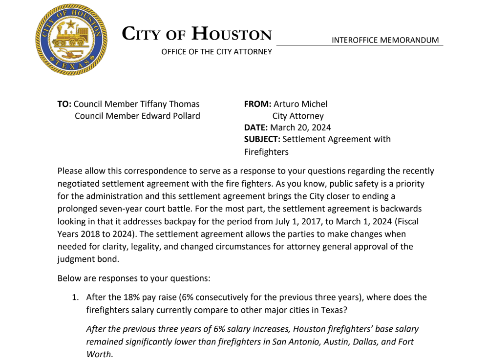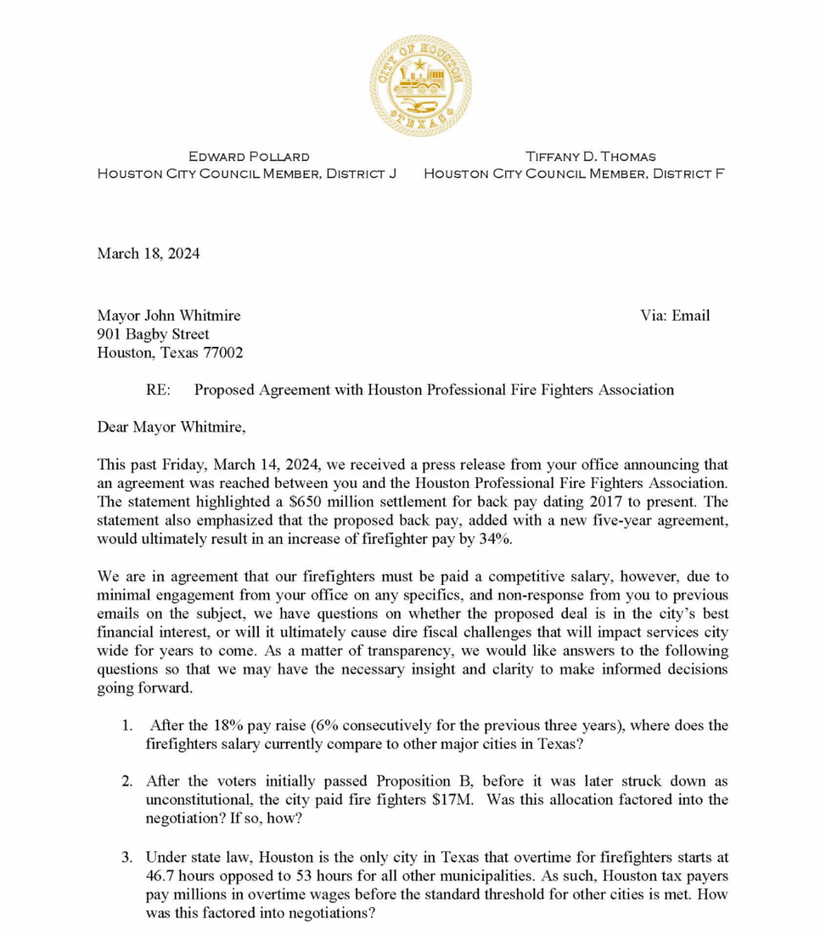 Letter to Mayor John Whitmire from Council Members Pollard and Thomas, 3/18/24; Reply from City Attorney Arturo Michel, 3/20/24