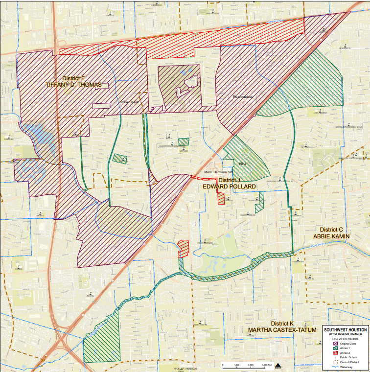 Look at the map of TIRZ #20 below. The colored areas crossed by diagonal lines are part of the TIRZ.*