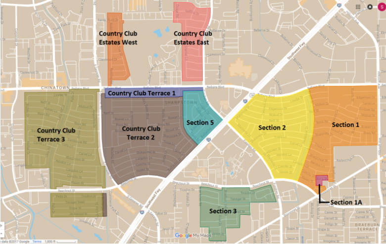 Does this mean you’re paying more taxes? Nope. TIRZ #20 just takes a portion of the taxes that property owners would have paid to the City of Houston anyway. It invests that money back into the community, into projects like reconstructing Bellaire Blvd. in 2014, replacing damaged portions of other Sharpstown streets in 2021, and building Club Creek Park, which is designed to hold the amount of water that would cover at least 120 acres one foot deep. That water could otherwise end up flooding the Brays Bayou area, which includes parts of Sharpstown, Westwood, Alief, and Braeburn.