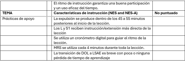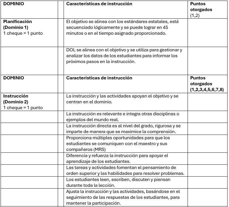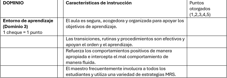 La rúbrica puntual también califica a los maestros según la frecuencia con la que usan MRS, cuán “seguras, acogedoras y organizadas” son sus aulas, cuán relevante es la instrucción para el LO, si “integran otras disciplinas y ejemplos del mundo real” y más.