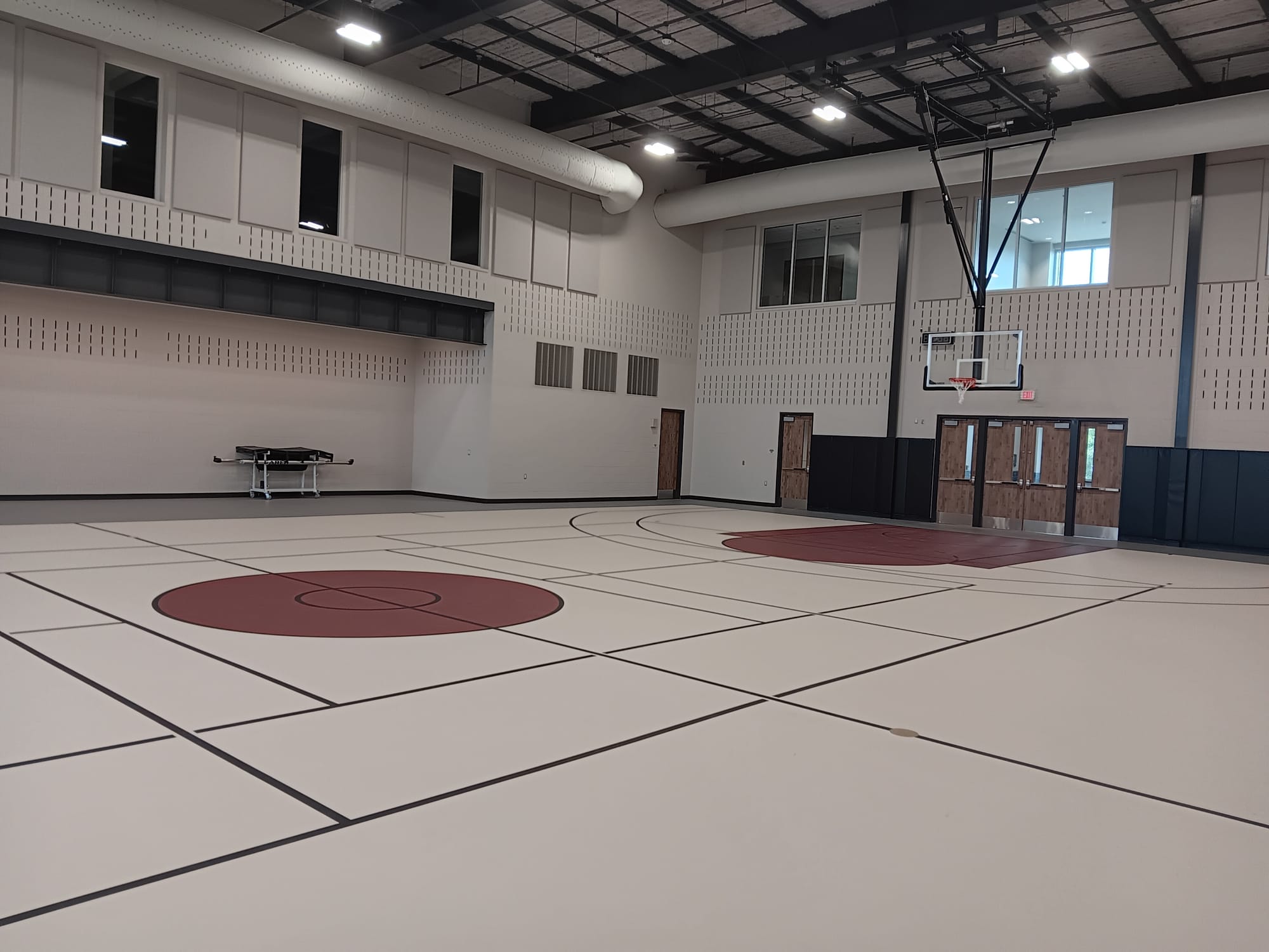 Students can also step into the adjacent gym for a game. The full-size court can be used for basketball, volleyball, or pickleball—and the walls are hardened for indoor soccer.